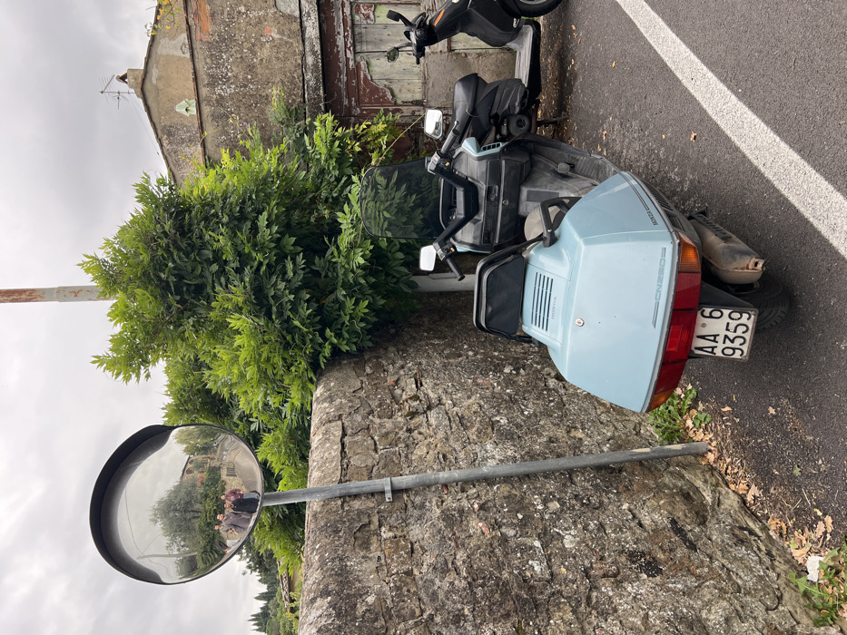 This image captures a street scene in Fiesole, Italy, under an overcast sky. A light blue Honda CN250 scooter is parked in the foreground, facing left, its rear displaying Italian license plate 'AA 6 9359'. A darker, partially visible scooter is parked immediately behind it. To the left, a weathered stone wall extends through the frame. A large circular convex traffic mirror, mounted on a metal pole, is positioned behind the wall, reflecting a group of approximately five individuals walking on a path, an olive tree, and distant structures. Dense green foliage rises behind the wall and scooters, partially obscuring a two-story building constructed of stucco and brick, featuring a tiled roof and dilapidated wooden double doors. A television antenna is visible on the building's rooftop. The ground consists of asphalt with a partial white road marking, and scattered leaves are visible along the base of the stone wall.