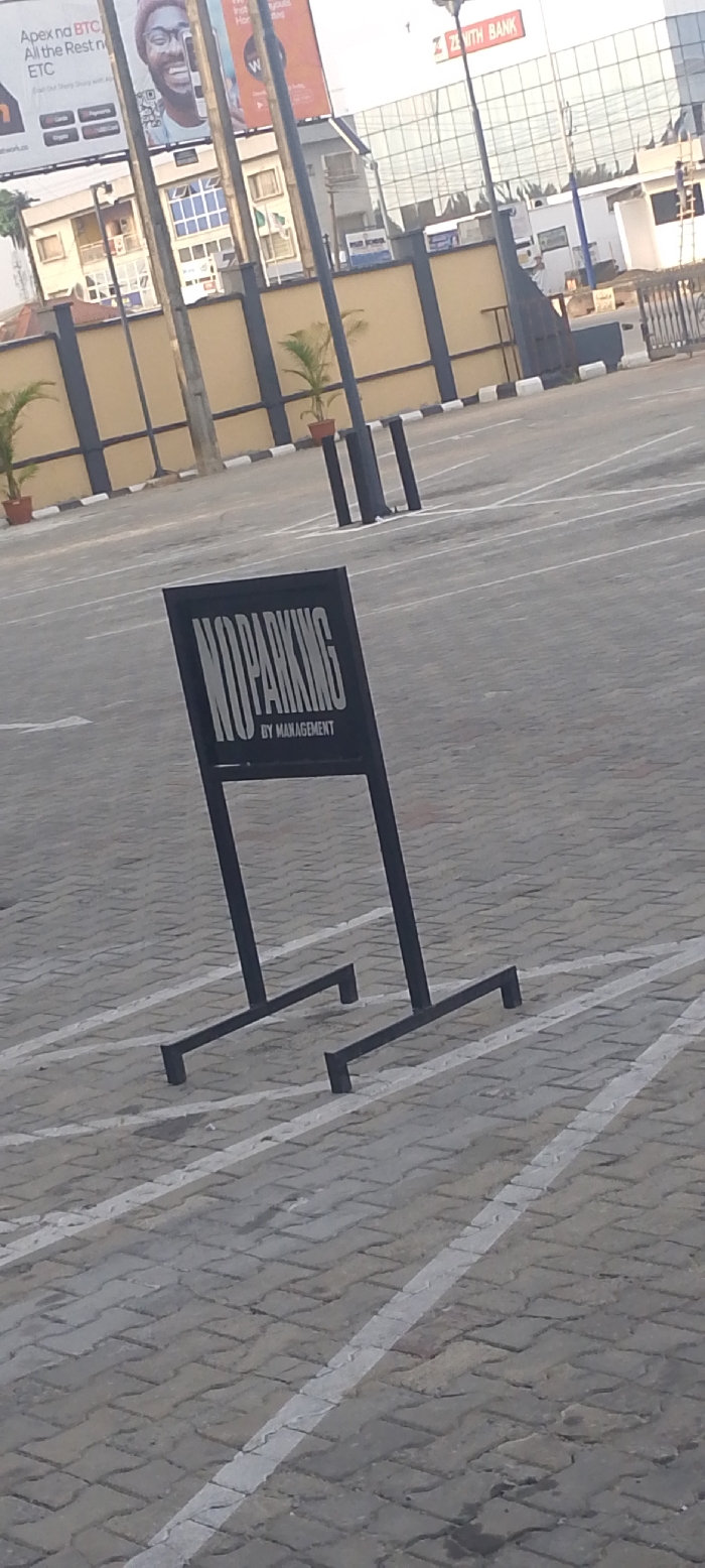 This image depicts an empty, outdoor paved parking lot in Warri, Nigeria, with commercial buildings in the background. In the immediate foreground, a black, A-frame sandwich board sign stands on grey interlocked paving stones. The sign bears the white text "NO PARKING BY MANAGEMENT" on its visible face. White lines are painted on the paving stones, delineating parking spaces. The midground consists of a large expanse of the same grey interlocked paving stones, entirely devoid of vehicles. Several dark-colored poles, likely light fixtures, are spaced throughout this parking area. Along the far perimeter of the parking lot, a low wall is visible, painted light tan with dark blue or black coping. Small potted plants, resembling palm saplings, are arranged at intervals along the top of this wall. In the background, multiple urban structures are present. To the left, a multi-story building with light-colored walls and blue-tinted windows is partially visible. Above this building, a large billboard displays a smiling man wearing a beanie and glasses, advertising "Apex ng BTC All the Rest ETC." To the right, a prominent building with a reflective glass facade is visible, topped by a "ZENITH BANK" sign. Utility poles and overhead wires are also present against the clear sky. The scene is illuminated by natural daylight, casting distinct shadows from the sign and poles. No individuals or vehicles are present in the observable area of the parking lot.