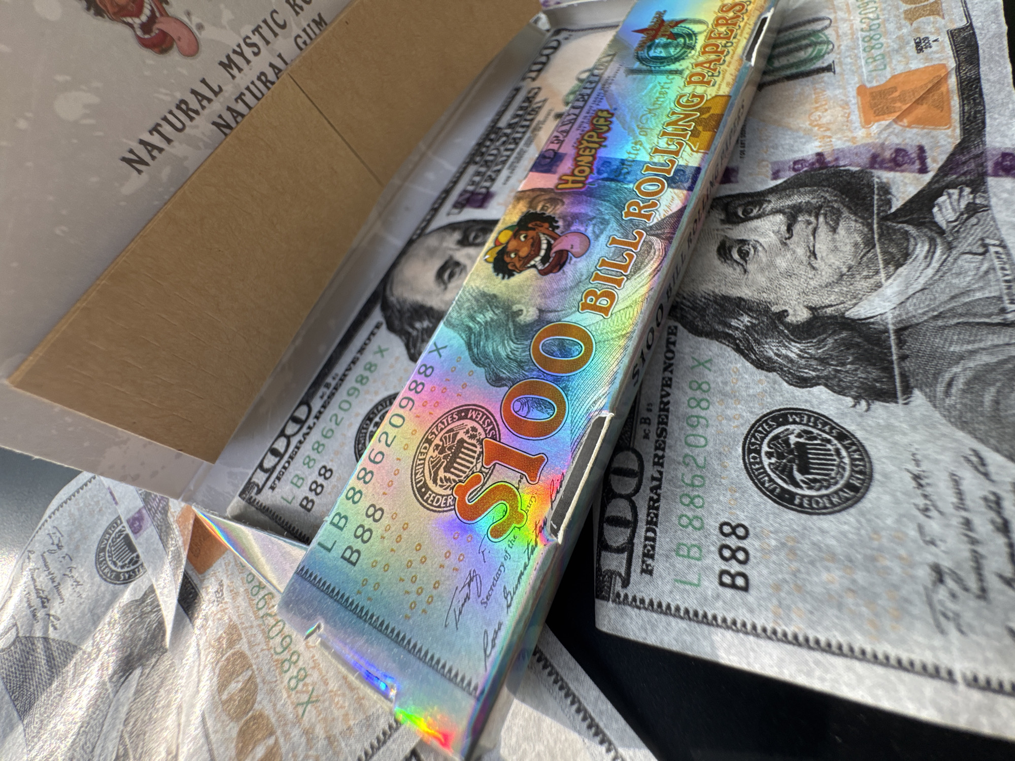 The image displays a close-up, high-angle view of several items designed to resemble US one-hundred-dollar bills. A prominent object in the foreground is a rectangular package identified as "BILL ROLLING PAPERS" by the "HONEYPUFF" brand. This package features a holographic design mimicking a $100 bill, including a stylized "$100" symbol, Benjamin Franklin's portrait, and a cartoon character with a grinning face, hat, and extended tongue. Text on the package reads "BILL ROLLING PAPERS" and "HONEYPUFF." Partially visible behind this package is a brown cardboard box, likely outer packaging, bearing the text "NATURAL MYSTIC R." and "NATURAL GUM." Surrounding and partially obscured by the rolling paper package are multiple sheets, some crumpled, also printed with detailed reproductions of $100 bill designs, including Benjamin Franklin's portrait, the "FEDERAL RESERVE NOTE" inscription, and specific serial numbers such as "LB 88620988 X" and "B88." These sheets appear to be novelty items or props. The scene is illuminated by an unseen light source, creating reflections and shadows. No individuals are present. The image provides no visual information to determine its location within the city of Sandrovo, Bulgaria.