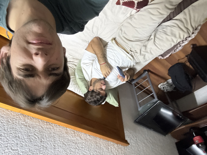 A selfie shows two young men in a bedroom. One man, closely cropped, is in the foreground wearing a dark green shirt. The second man lies on a bed wearing a white shirt and light-colored pants, holding a mobile phone. A red and brown throw pillow is at the head of the bed. A small silver drying rack and black speakers are beside the bed on the wooden floor. The wall is textured.