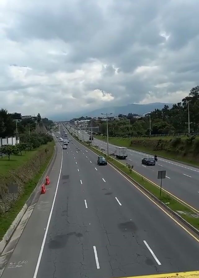 highway with multiple lanes in both directions, viewed from a bridge. The road has white lane markers and a yellow median divider. Several cars and trucks are visible moving along the highway. On either side of the road, there is greenery including grass and trees. The sky is overcast with dark clouds. In the distance, mountains are visible. The yellow rail of the bridge is partially visible at the bottom of the frame.