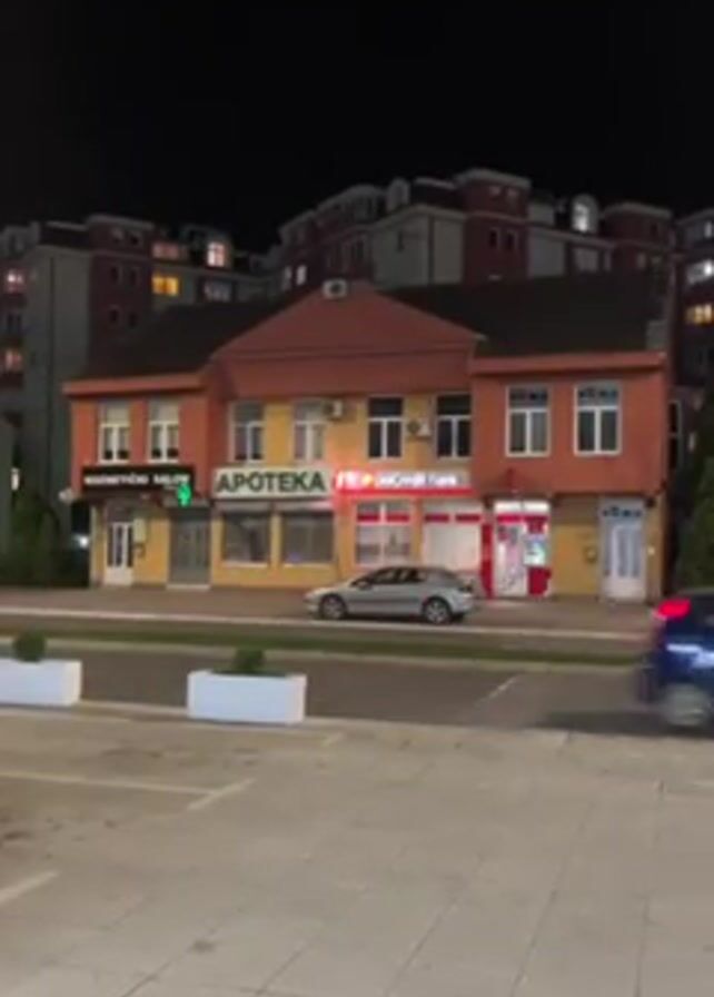building at night. The building is two stories tall and has several businesses on the ground floor, including a beauty salon, a pharmacy, and a bank. There are cars driving past the building. The building is surrounded by a paved area and there are some trees and bushes nearby. The sky is dark and there are some lights visible in the distance.