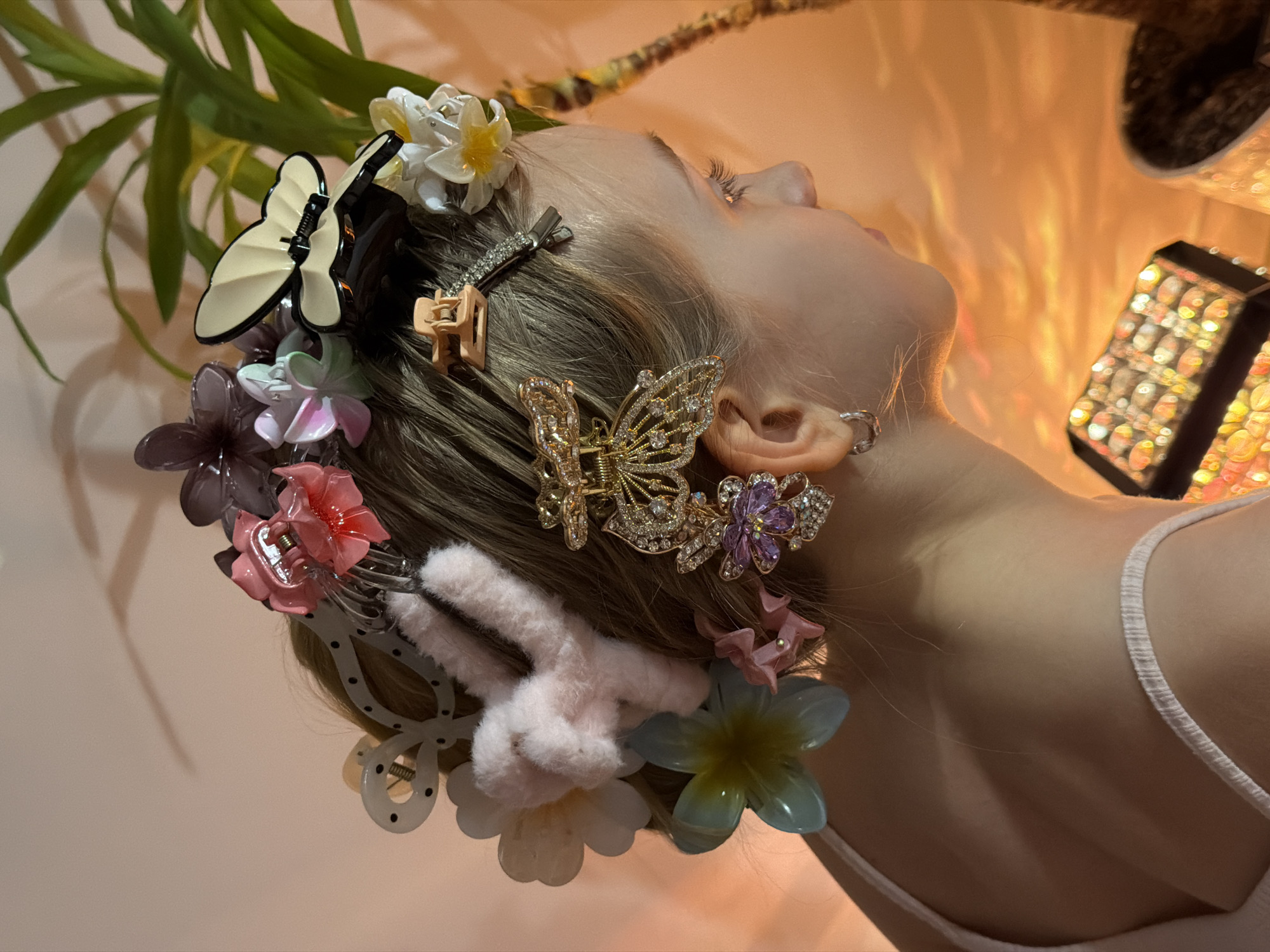This image depicts an indoor scene in Dreiliņi, Latvia, featuring an individual, likely a young female, in a right-profile view. The subject has light brown hair and smooth skin, and is wearing a light-colored spaghetti-strap garment. Her left earlobe is visible, adorned with a small silver-colored hoop earring. The individual's hair is extensively accessorized with numerous decorative hair clips, primarily concentrated on the top and right side of the head. These include various styles such as claw clips, snap clips, and decorative pins. Specific clips identified are: multiple flower-shaped claw clips in colors including translucent pink, purple, light blue with a yellow center, and white with a yellow center; a large cream and black butterfly-shaped claw clip; an ornate gold-colored butterfly-shaped claw clip embellished with clear rhinestones; a light pink fuzzy clip resembling bunny ears or a bow; a white claw clip with black polka dots; a small peach-colored mini claw clip; and a silver-colored snap clip adorned with rhinestones. The environment is characterized by warm, orange-toned ambient lighting. In the background to the right, a potted plant with green leaves and a textured brown stem is partially visible. A luminous, patterned decorative lamp or light box is present in the lower-left quadrant, emitting warm, varied light. The background wall appears to be a pale, warm tone. No active interactions or specific actions beyond posing are observable.