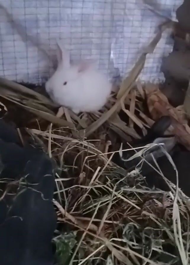 The camera observes two small rabbits, one white and one black, resting in a cage filled with straw