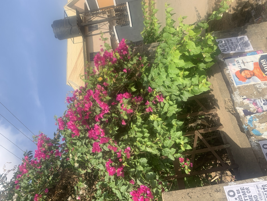 This image depicts an outdoor scene in Jos, Nigeria, under a clear, bright blue sky. A dense bougainvillea bush with numerous vibrant pink flowers and green foliage dominates the left and central portions of the frame, partially obscuring a rusty metal fence or gate in the lower-mid section. In the foreground, a weathered concrete wall or pillar runs horizontally across the bottom. Multiple flyers and posters are adhered to this wall. A prominent poster on the lower-right features a woman in an orange hat, with text including "Anna" and "Glory." To its right, another poster advertises "N.G.O. Work with us as PART-TIME FULL-TIME OR WEEKEND" with a Nigerian phone number (0706626478). Faded and torn remnants of other posters are also visible. In the background, on the right side of the image, a building with a light-colored, possibly tan or orange, pitched roof is visible. The building's walls appear to be a light peach or beige. Above the building's roofline, a black plastic water tank is mounted on a tall, dark metal support structure. Utility wires or power lines traverse the upper portion of the sky. A portion of an unpaved or dirt road is visible on the far right edge of the frame. No individuals are present in the scene.