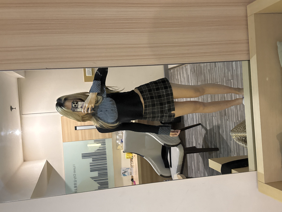 A person is reflected in a full-length mirror, standing in an indoor setting. The individual, appearing female, has light brown hair and is wearing a black long-sleeved top with a grey striped faux-collar and cuff details, paired with a dark plaid mini-skirt featuring a front slit. White slippers are visible on the feet. The person holds a smartphone with both hands, positioned to capture the reflection. The background, visible through the mirror's reflection, depicts a room with light-colored walls. On the left wall, a large art piece displays a grey cityscape silhouette and text "I love City life" above "我爱城市生活", confirming a location in China. Below the art, a light wooden desk or dresser holds small clear bottles and a yellow cup. A light grey upholstered armchair with wooden legs is situated near the desk, with a dark strap or garment draped over its back. The floor is light-colored. The room appears to be a hotel room or residential interior. While the text on the wall art indicates China, the specific location within Yuzhong District is not discernible from the image.