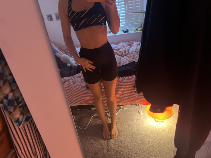The image displays a mirror reflection of an individual standing in a bedroom within the city of Unknown, Unknown. The subject, a person appearing to be female, is barefoot, wearing a black and white patterned sports bra and black biker shorts. One hand is placed on their left hip/buttock. The room's reflection reveals an unmade bed with red and white striped bedding, a white stuffed rabbit, and a dark piece of clothing. A wall with white louvered window shutters and two framed pictures is visible behind the bed. Small objects are present on the windowsill. The floor is carpeted. An orange-glowing table lamp sits on the floor to the right, adjacent to a white power cord. A dark garment partially obstructs the right side of the reflection.