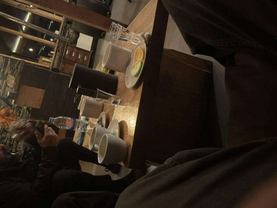 This image depicts an indoor scene within a rustic guesthouse or common area, consistent with the architectural style found in Juta, Georgia. The foreground is occupied by the legs and dark trousers of a seated individual, presumably the photographer. Centrally positioned is a substantial rectangular wooden table, its surface reflecting ambient light. Upon the table are numerous objects: a plastic bottle of Rchveli brand water with a blue cap, two white ceramic cups resting on saucers, an additional white ceramic mug, a dark-colored insulated jug or French press, and two clear shot glasses, one appearing empty and another potentially stacked or containing a clear liquid. A small white plate holds a single slice of green apple and a single slice of orange. A blue fabric item is also visible on the table. To the left of the table, a male subject is seated, visible from the chest up, dressed in dark clothing (jacket and trousers). He possesses a beard and is actively engaged with a smartphone, holding it with both hands and looking down at the screen. In the blurred background to the left, a third individual with reddish-orange hair is partially discernible. The room's environment features a prominent wall constructed from natural stone blocks. Dark wooden cabinetry with multiple drawers is visible in the mid-background. Wooden structural beams are part of the ceiling or wall framework, and a metal pipe, possibly a stove flue, extends vertically. The lighting is low and warm, contributing to a cozy, somewhat dimly lit atmosphere.