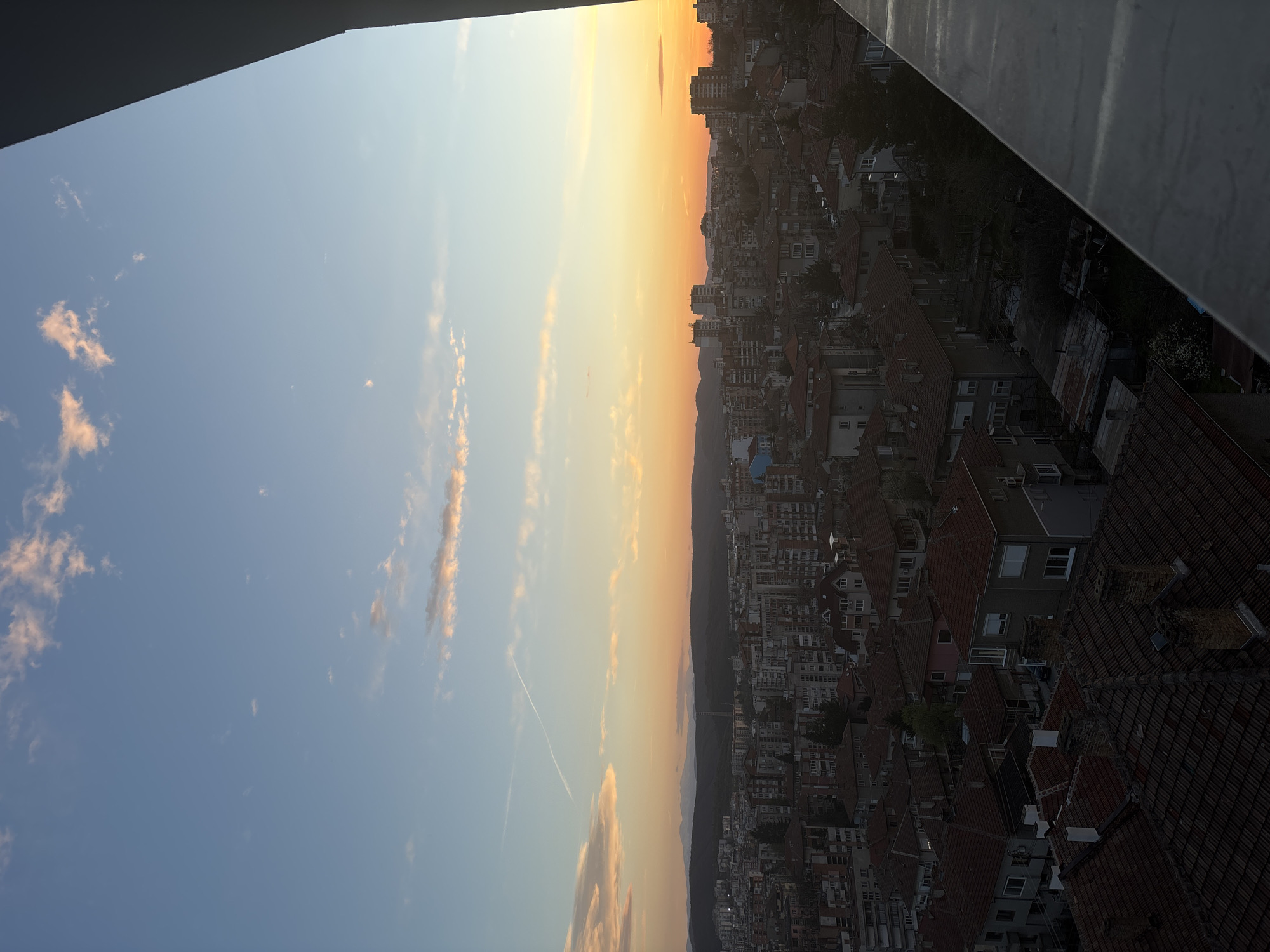 cityscape at sunset. The sky is a gradient of blue, yellow, and orange. Wisps of clouds are visible in the sky. Below the horizon, a dense cluster of buildings with red tile roofs forms a sprawling cityscape. The photo is taken from a high vantage point, possibly a building's balcony or rooftop. A dark, gray ledge or edge of a structure is visible in the top right corner of the frame. I'm unable to provide the location in the city of Veliko Tarnovo, Bulgaria.