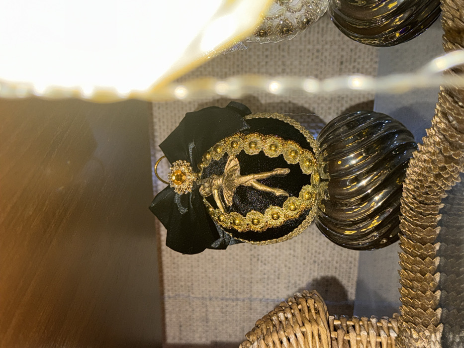 The image displays a collection of decorative ornaments. A black velvet ornament with a golden ballerina figure at its center, surrounded by gold trim, is adorned with a black bow. Beside it is a glossy, swirled black ornament. Additional ornaments, including a golden pinecone-like decoration and a beaded white ornament, are partially visible. A string of lights adds a warm glow, with a neutral-toned surface serving as the backdrop.