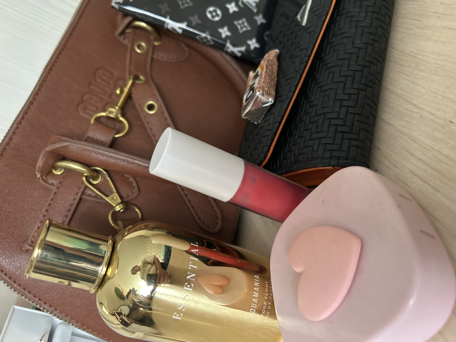 The image displays a close-up arrangement of personal items on a light-colored, wood-grained surface. In the foreground, a light pink, heart-shaped compact or container is positioned. To its right, a transparent tube of bright pink lip gloss with a white cap stands upright. A gold-colored perfume bottle, labeled "ESSENTIAL AQUAMANIA POUR FEMME EAU DE PARFUM," is prominently placed behind the compact and partially behind the lip gloss. The reflective surface of the perfume bottle shows a clear reflection of a person, likely the photographer, wearing a light-colored patterned shirt and holding a mobile device, set against a background featuring a patterned wall or curtain. Behind the lip gloss and perfume, a black textured wallet or clutch with orange trim and a silver-colored clasp is visible. Resting on this wallet is a crumpled silver and brown wrapper, identifiable as a Toblerone chocolate wrapper. Partially obscured behind the black wallet is a smaller black item with a white monogram pattern, resembling the Louis Vuitton logo. In the background, a brown leather or synthetic handbag with the "miu miu" logo embossed on its side is visible, featuring gold-colored clasps and eyelets. The exact location in Chaikovsky, Russia, cannot be determined from the visual information provided.