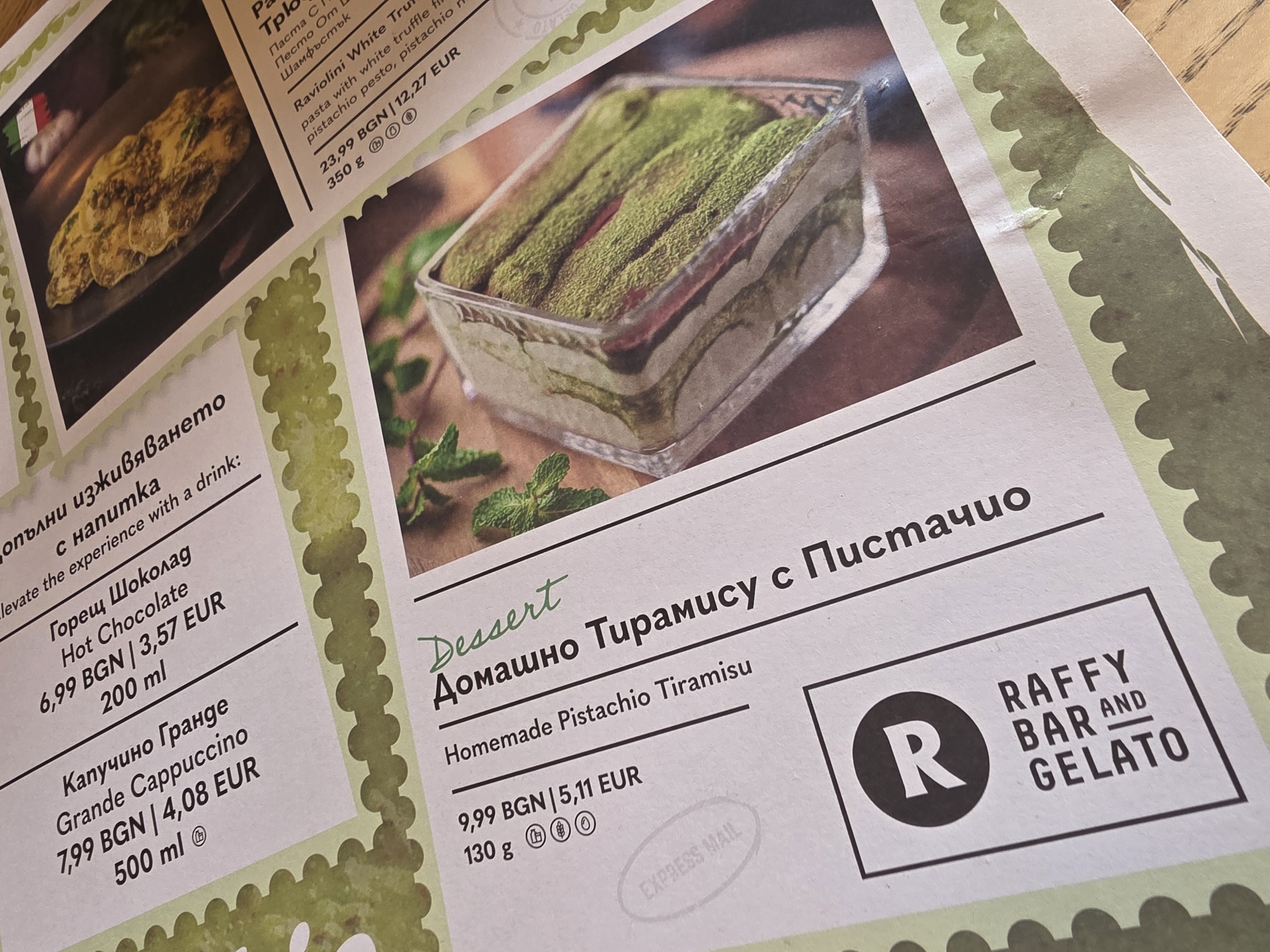 The image displays a close-up, angled view of a printed menu from "Raffy Bar and Gelato," positioned on a light brown wooden surface. The menu is characterized by a light background with a green, scalloped border design. Visible menu sections include: - **Beverages:** "Hot Chocolate" (Горещ Шоколад) at 6,99 BGN (3,57 EUR) for 200 ml, and "Grande Cappuccino" (Капучино Гранде) at 7,99 BGN (4,08 EUR) for 500 ml. - **Main Course (partially visible):** "Raviolini White Truffle" (Raviolini with white truffle pasta) with pistachio pesto, priced at 23,99 BGN (12,27 EUR) for 350g. An accompanying image shows an oblong, yellow food item on a dark plate, with a small Italian flag icon. - **Dessert:** Titled "Dessert" (Десерт) in green cursive, it features "Homemade Pistachio Tiramisu" (Домашно Тирамису с Пucmaчиo) priced at 9,99 BGN (5,11 EUR) for 130g. An image alongside this listing shows a clear, rectangular plastic container holding a green, layered dessert, garnished with mint leaves in the background. The bottom of the menu displays the "RAFFY BAR AND GELATO" branding, with a black square logo containing a white 'R' inside a circle. The use of Bulgarian Lev (BGN) and Cyrillic script, combined with the brand name "Raffy Bar and Gelato" (a known chain), indicates the location is within a Raffy Bar and Gelato establishment in the city of Plovdiv, Bulgaria. A minor tear or crease is visible on the green scalloped border near the bottom right.