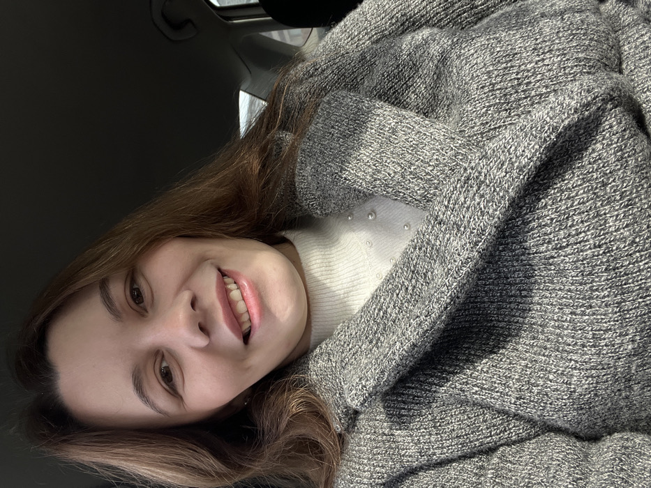 A female subject is depicted in a close-up, chest-up shot, seated within what appears to be a vehicle interior in Leninakan, Russia. She has brown hair, a fair complexion, and is smiling, revealing her teeth. She is wearing a white turtleneck or mock-neck sweater adorned with small, spherical white embellishments on the front. Over this, she wears a grey, knitted coat or jacket with visible lapels. The background shows a dark car headliner to the upper right and a blurred view through a window, indicating ambient light and indistinct external shapes.
