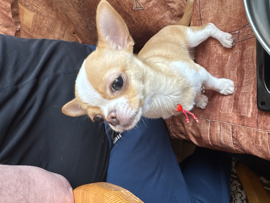 The image displays an indoor scene, reportedly located in the city of Tervel, Bulgaria. The primary subject is a small, short-haired Chihuahua dog, exhibiting fawn and white coloration, with white markings on its muzzle, chest, belly, and paws. A small red and white braided charm is secured around its neck. The dog is seated upright on a patterned fabric cushion, which features abstract geometric designs in shades of brown and orange. Its head is tilted slightly upwards and to the left, with its gaze directed out of frame. Partially visible on the left side of the composition are the lower torso and upper legs of a human, wearing a black garment and dark blue athletic pants. A light-colored wooden object with visible vertical grain is situated to the far left. An indistinct dark object is partially visible in the lower right foreground. The scene appears to be static, with no overt actions or direct interactions depicted between the dog and the partially visible human.