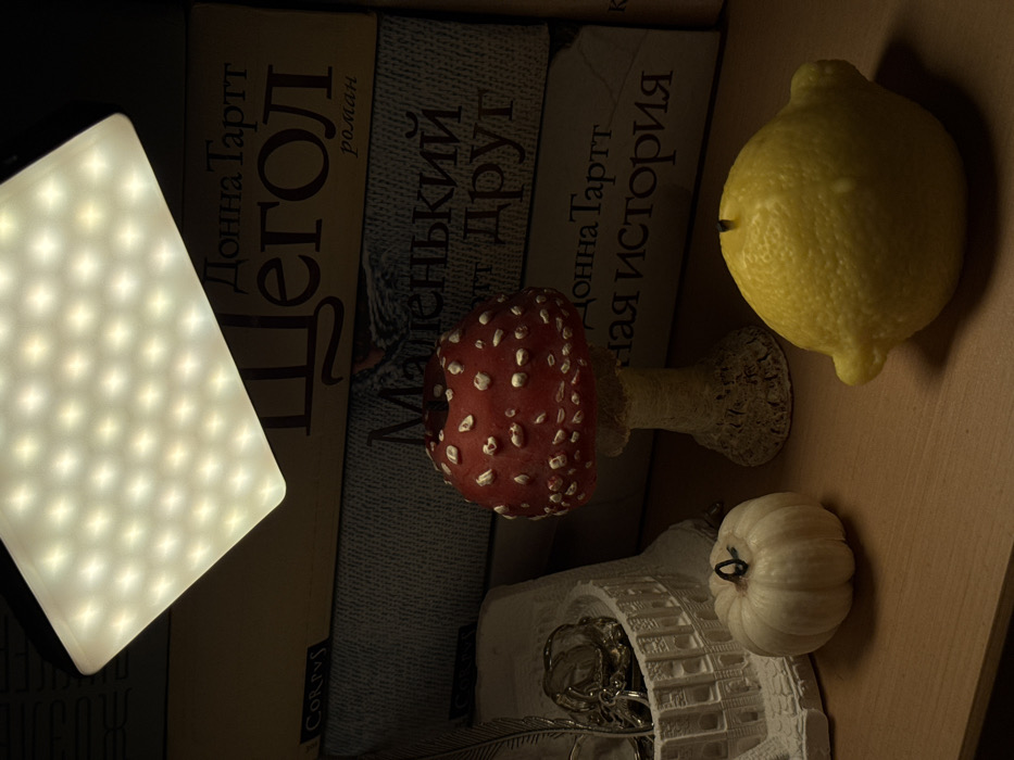 The scene depicts an indoor still life on a flat, light-brown wooden surface in Tliustenkhabl', Russia. A rectangular LED light panel, composed of multiple individual emitters, hangs from above the upper left portion of the frame, casting bright white light onto the foreground objects. From left to right in the foreground: 1. A white, possibly ceramic or plaster, decorative holder with an architectural, columned design. Inside, a metallic ornament and a silver-colored quill or feather are visible. 2. A small, cream-colored pumpkin-shaped figurine with vertical ridges and a dark stem. 3. A red and white spotted decorative mushroom figurine, resembling an Amanita muscaria, resting on a textured, light-colored stem. 4. A yellow, textured lemon-shaped candle with a visible black wick at its top. In the background, a vertical stack of books is arranged. The top book spine reads "Донна Тартт ЩЕГОЛ роман" (Donna Tartt The Goldfinch novel). The middle book spine displays "Маленький друг" (The Little Friend). The bottom book spine reads "Донна Тартт Тайная история" (Donna Tartt The Secret History). A book with "Corpus" printed vertically on its spine is partially visible on the far left. No individuals are present. No actions or dynamic interactions are depicted; all objects are static.
