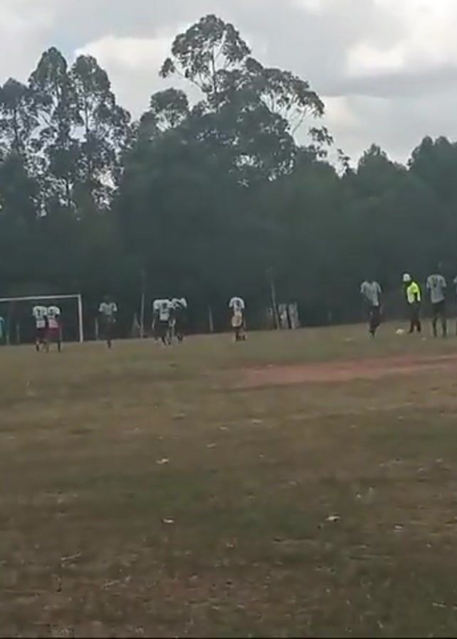 A soccer game is taking place on a grassy field bordered by trees. There are players in various jerseys, some preparing to kick a ball towards a goal. The sky is cloudy. There is a rudimentary fence on the periphery of the field.