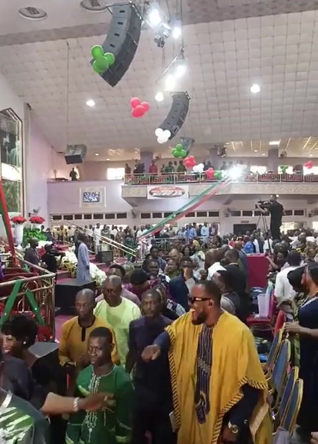 The video captures a large crowd of people inside a spacious, well-lit hall, likely a church or event center, filled with decorations. The crowd is diverse and includes both men and women of different ages, many wearing traditional African attire. Some individuals are moving, and there is a sense of lively activity in the room. The hall features high ceilings with suspended lighting and speakers. There is a balcony area visible towards the back of the hall where more people can be seen. Decorations such as balloons in red, white, and green are scattered throughout the space, adding to a festive atmosphere.