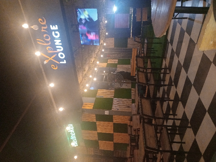 An outdoor lounge area features "Explore Lounge" signage illuminated by string lights. A television screen is mounted above. Seating includes wooden tables and chairs on a tiled, checkered floor. A "Heineken" sign is displayed. The space has a mix of wood and green wall decor, creating a relaxed and inviting atmosphere.