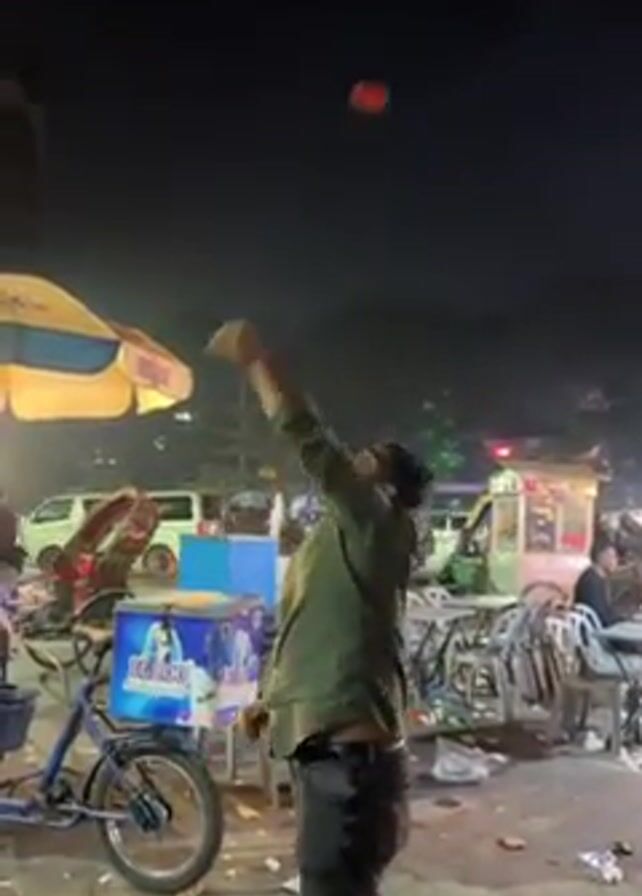man standing in a busy outdoor area at night, launching a small, red object into the air. The area appears to be a street market, with food stalls, bicycles, and other vendors nearby. The man is wearing a green shirt and dark pants, and he has a beard. He launches the red object, and then looks up to watch it float into the air. In the background, there are bright blue and purple lights shining into the sky. The ground is littered with debris. The video ends with the man looking up at the lights and talking on his phone.