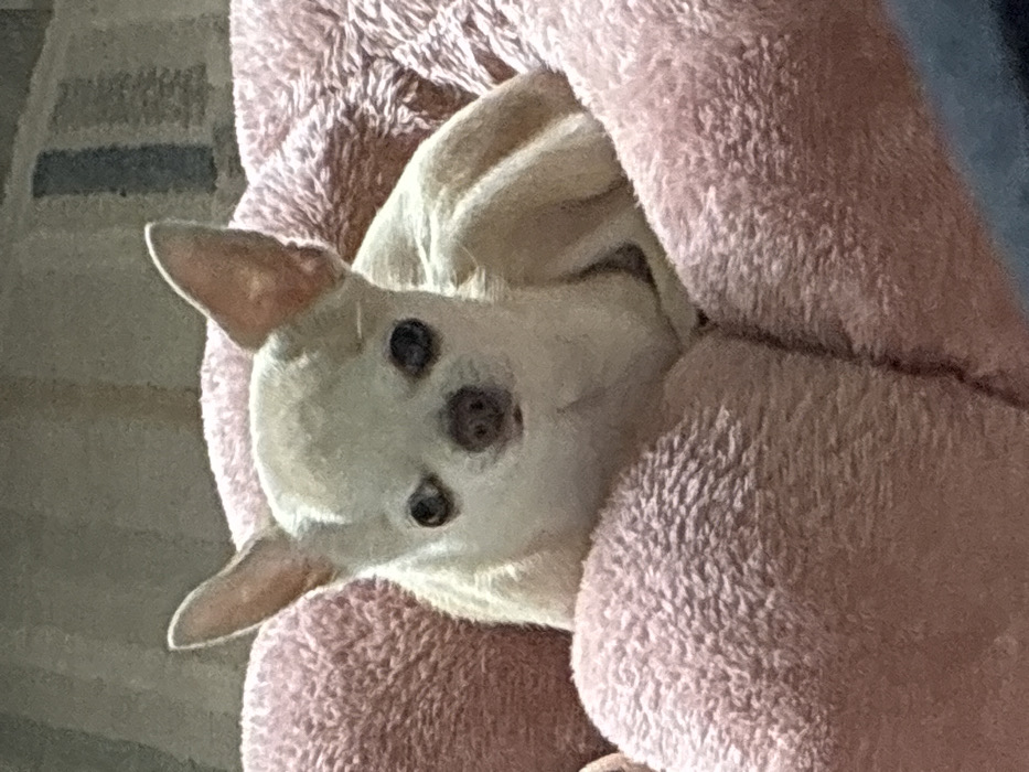 - "A cream-colored Chihuahua dog is observed resting within a circular, plush pink pet bed in an indoor setting" by FM-vqTsz2, licensed under CC BY 4.0