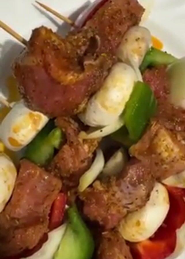 plate of uncooked shish kebabs containing chunks of meat, onions, red and green bell peppers, and mushrooms. The camera then moves to a close-up of the same shish kebabs cooking on a black electric grill. Steam rises from the kebabs as they are grilled.