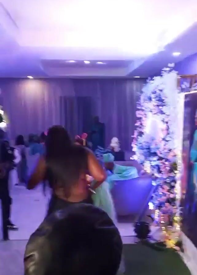 The video takes place in a dimly lit, brightly decorated room with a white ceiling, likely at an event or party
