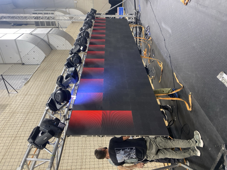 A large LED display is elevated on a metal truss, illuminated with a gradient of red and blue. Attached to the truss are multiple stage lights. Yellow straps and cables clutter the floor beside the display. Two people, one in a black t-shirt and green pants, stand near the edge of the display, seemingly working on the equipment. The backdrop is a combination of industrial architecture and a black wall.