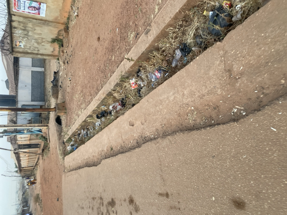 The image depicts an outdoor street scene in Sabon Gari Nassarawa, Nigeria, under a hazy daylight sky