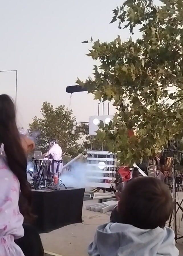 concert viewed from behind a few people, looking up towards the stage. A drummer is visible on stage, playing in front of lights and a smoke machine. There are several people in the background, also watching the concert. The sky is visible in the background, and there are trees in the foreground that partially obstruct the view. Several people are holding up their phones to record the performance.