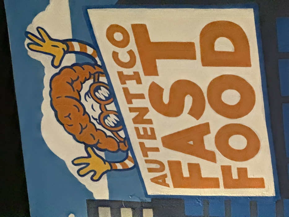 A cartoon brain with goggles peers from behind a white sign. The sign reads "AUTENTICO FAST FOOD" in orange block letters. The brain is orange with a dark blue outline. It has yellow hands with striped arms. The background features a blue sky and a cityscape with gray and white buildings. The sign is angled to the right, partially obscuring the cityscape.