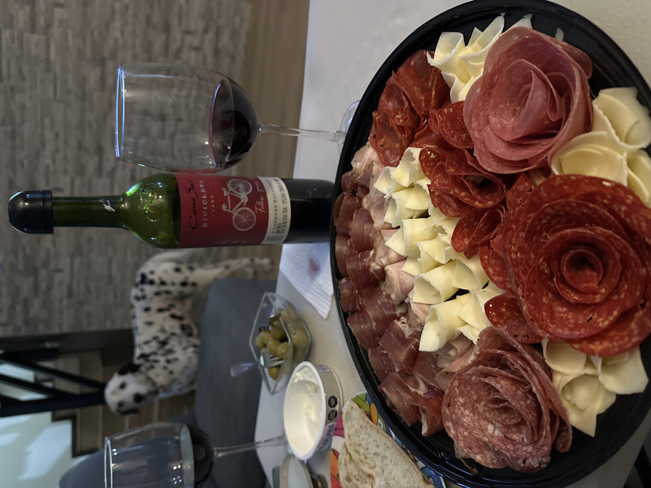 A charcuterie board with meat roses, various salami and sliced meats, and cheese triangles is set on a table. A bottle of wine and a glass of red wine are present. Olives and a small container of spread are also on the table. A loaf of bread is partially visible. A Dalmatian dog is visible in the background. The table is covered in a white cloth.