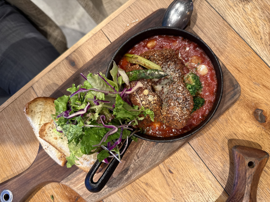 A high-angle, close-up view of a meal served in a restaurant in Yokohama, Japan. The central subject is a black cast-iron skillet containing a red tomato-based sauce, several small white spherical objects, and green broccoli florets. Layered on top are two golden-brown, breaded cutlets, heavily dusted with grated white cheese and dark specks. Green asparagus spears are visible among the cutlets. A fresh salad of green lettuce and purple cabbage shreds is piled atop the cutlets. The skillet rests on a dark-stained wooden serving board, which also holds two slices of toasted bread. A silver spoon is positioned to the right of the skillet. The serving board and skillet are placed on a light-colored wooden table with distinct grain patterns. In the upper right background, a person's leg in dark grey trousers and part of an upholstered chair are visible, indicating a seated diner. Another wooden object is partially visible in the lower left corner.