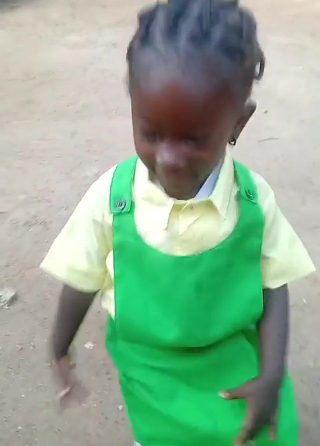 A young girl is the focus of this outdoor video. She is wearing a bright green jumper dress over a short-sleeved, yellow collared shirt. Her hair is styled in braids. The background is a sandy ground with a car visible in the upper left corner. The girl is seen walking and smiling at the beginning, later she interacts with an object outside of the frame.