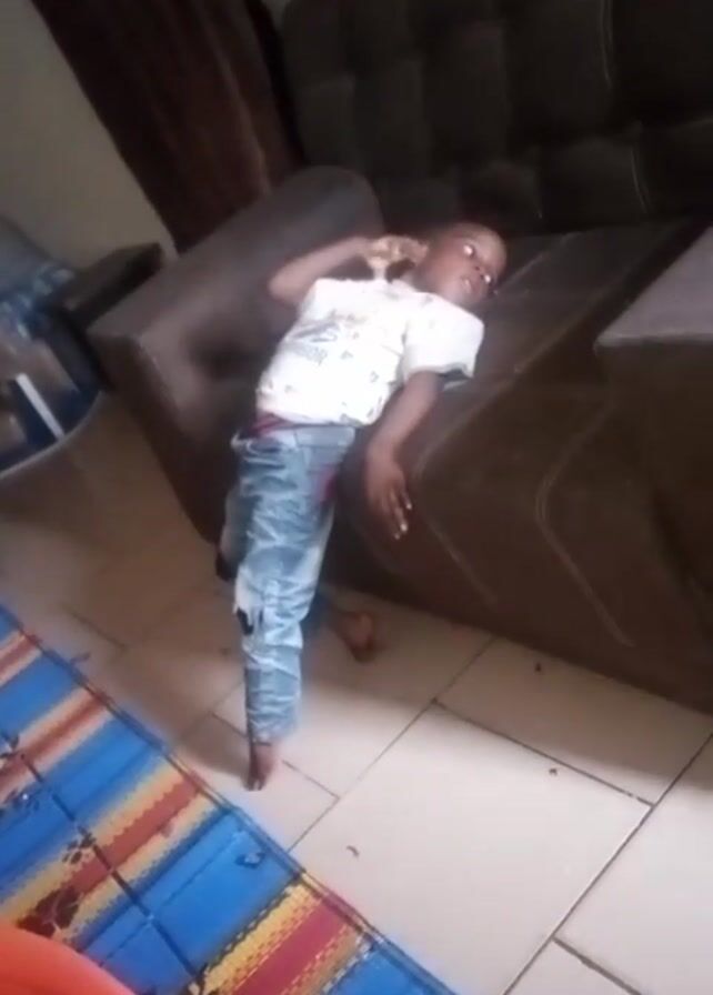 A young child lies on a brown sofa, with one arm behind their head and one leg dangling off the side. The child is wearing a white shirt and light blue jeans. The sofa is in a room with tiled floors and a blue and yellow patterned mat. There is a brown curtain in the background. The camera angle is slightly tilted downward, providing a full shot of the child and the sofa.