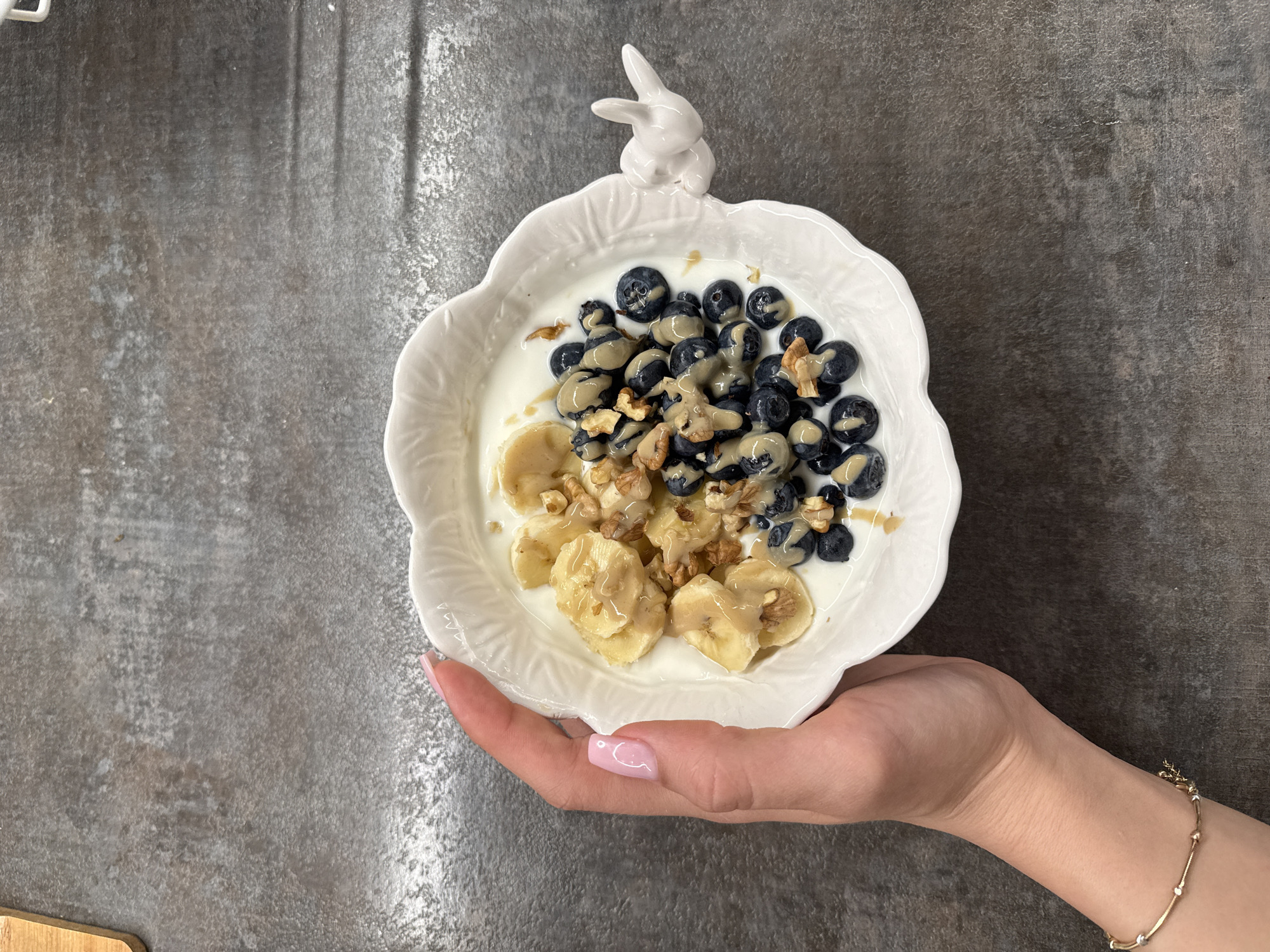 The image presents a hand holding a white, flower-shaped dish. The dish contains a yogurt base topped with blueberries, sliced bananas, and chopped walnuts, drizzled with a light-colored syrup. The hand is light-skinned with a pale pink nail polish. The foreground is a gray, textured surface. The environment, location and all other details are not available from the image.