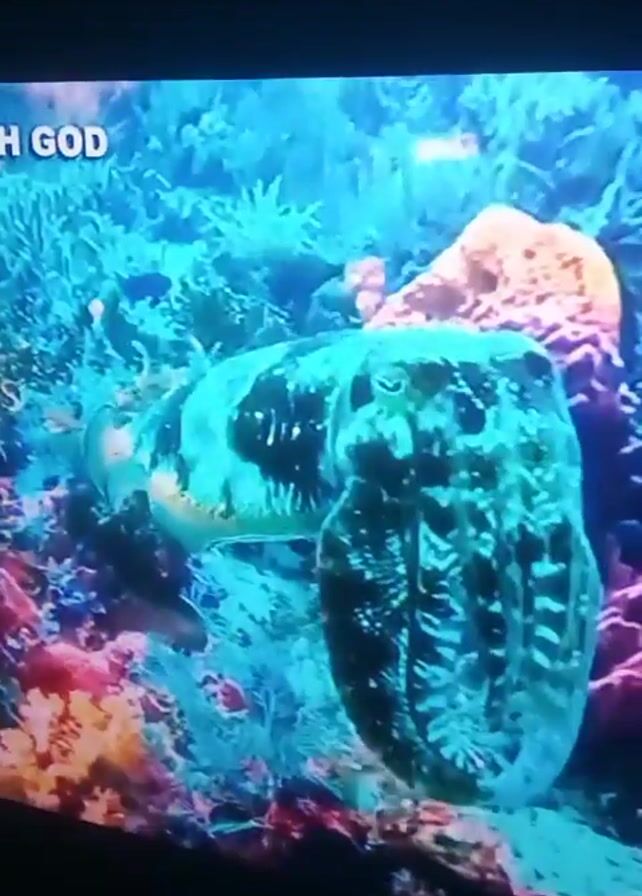 cuttlefish in a vibrant underwater environment. The cuttlefish is the main subject, displaying various shades of green and brown, and its skin texture is visible. It's surrounded by colorful coral and marine vegetation in shades of blue, orange, and pink. The background is a mix of blurred details, creating a sense of depth. The text "H GOD" is visible in the upper left corner of the screen.
