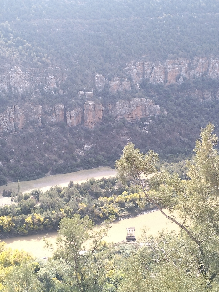 The image presents a panoramic view of a mountainous river valley in Bin El Ouidane, Morocco. The upper background features hazy, forested mountains, transitioning to prominent grey-brown and reddish geological rock formations, including vertical cliffs and horizontal ledges, interspersed with sparse dark green vegetation. A wide, light brown river flows through the valley floor, bordered by dense vegetation consisting of light green, yellow-tinged, and darker green trees and bushes. Near the river's center-right, a small, multi-story structure, primarily white with dark detailing, stands on a dark base directly within the water. The immediate foreground is occupied by the branches and green foliage of trees, partially obscuring the lower portion of the view. No human figures, animals, or explicit actions are discernible.