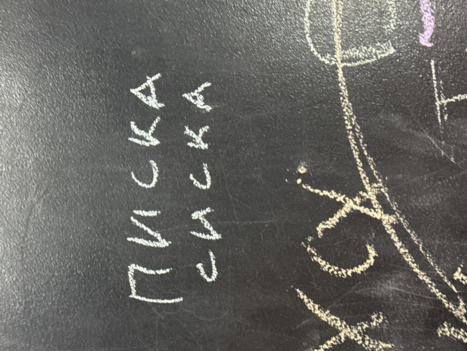 The image displays a dark, textured surface, likely a blackboard or a dark wall, defaced with chalk-like markings. Prominently centered are two lines of handwritten Cyrillic text in white. The top line reads "ПИСЬКА" (PIS'KA), and the bottom line reads "СИСЬКА" (SIS'KA), both crude Russian slang terms. Below these words, additional white chalk marks are visible, including a prominent 'X' or cross-hatch pattern on the left and various curved lines. A faint segment of purple chalk is present in the lower right portion of the image. No individuals are depicted. The scene suggests a public or institutional environment in the City of Binghamton, United States, such as a classroom or common area, where the surface has been used for informal writing or graffiti.