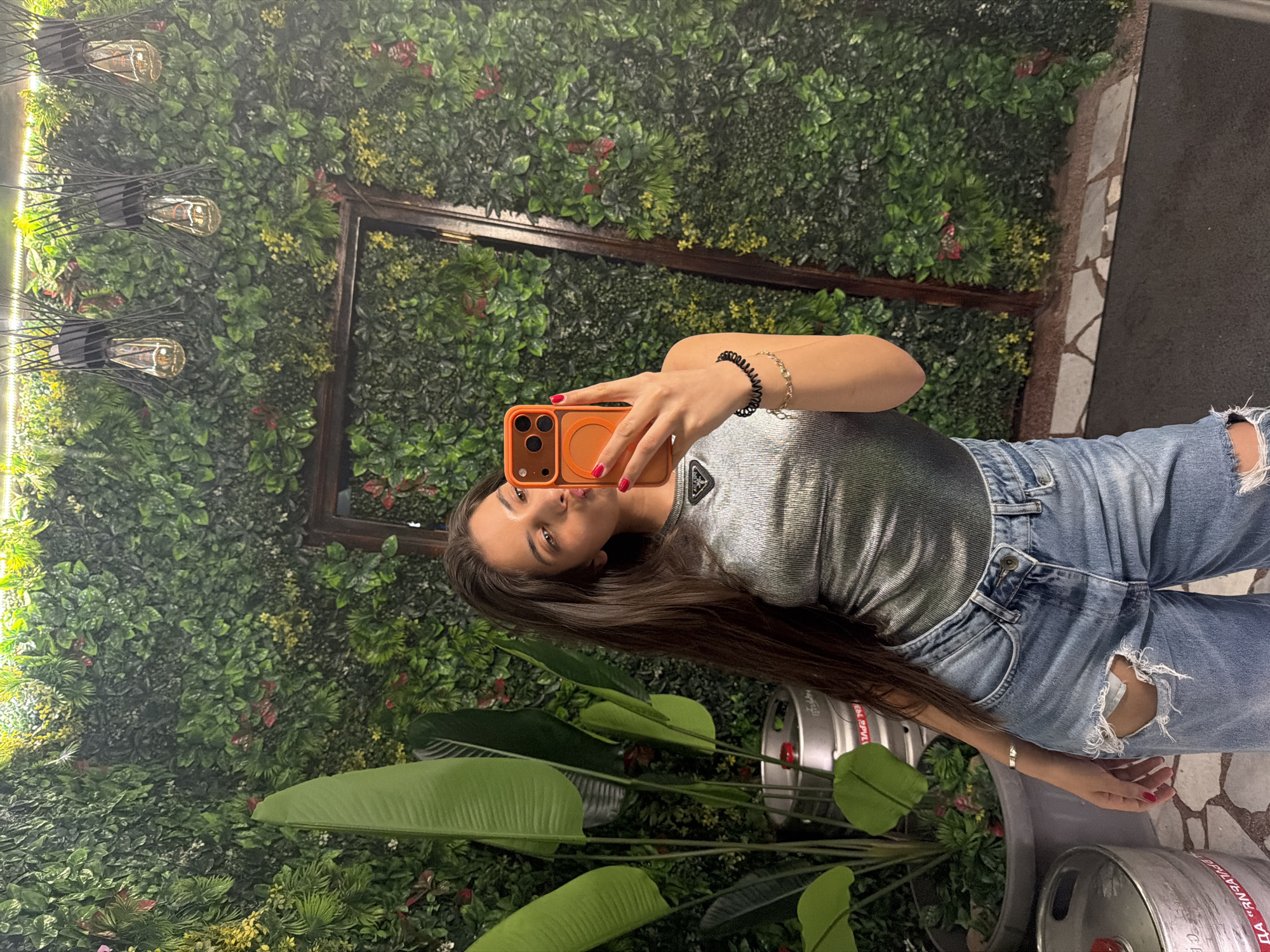 A young woman is taking a selfie with an orange smartphone in what appears to be the city of Rudartsi, Bulgaria. She is wearing a silver-grey shiny tank top and ripped blue jeans. She is standing next to a plant in a container and in front of a wall covered in green foliage. Her hair is long and brown. Two metal kegs are visible on the floor. The lighting suggests it is either indoor or a covered outdoor area.