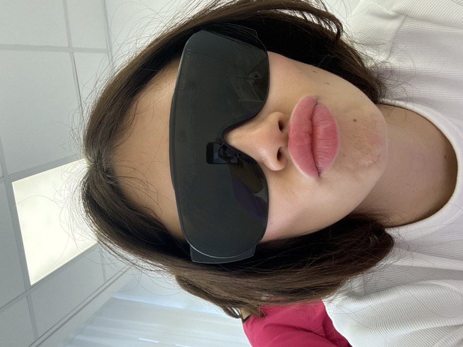 A female subject is shown taking a selfie indoors. She is positioned facing the camera, wearing large, dark laser-protective glasses with "OD 5+ @ 190-532, 700-1100nm CE" specifications visible on the upper right edge. Her lips are pursed. A smartphone, used to capture the image, is reflected in the left lens of her eyewear. She wears a white ribbed t-shirt. In the background, behind and to the left of the primary subject, a second individual is partially visible from the back, wearing a bright pink garment. The immediate environment consists of a white grid ceiling with recessed fluorescent lighting panels and light-colored walls, indicative of a clinical or professional facility. This scene takes place in the city of Bnei Brak, Israel.