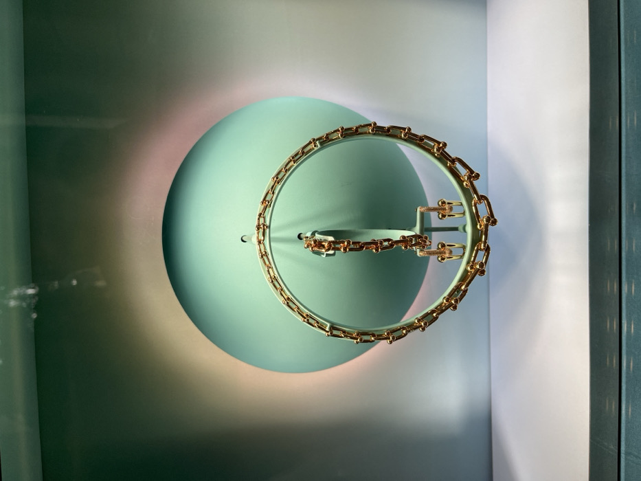 The image displays a retail jewelry exhibit inside a glass storefront window. The central subjects are a set of gold-toned chain link jewelry, consisting of a necklace, a bracelet, and a pair of earrings. The necklace is draped in a circular arrangement around a teal-colored, ring-shaped display component. A matching bracelet hangs vertically from a central teal support within this ring, with two U-shaped gold earrings, each embellished with small white stones, suspended from its lower end. The jewelry is presented against a larger, semi-circular teal backdrop that shows subtle pink and purple light gradients on its upper left side. The entire arrangement rests on a light blue-grey base, visible through reflections and minor smudges on the protective glass. This display is located at the Tiffany & Co. boutique in Galleria Cavour, 1, 40124 Bologna BO, Italy.