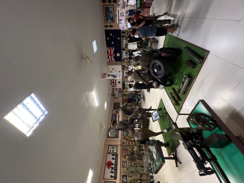 This indoor shot shows a museum exhibit, with a low-angle, wide perspective capturing the full space. Displays feature vintage military equipment, including motorcycles, mannequins on horseback, and various weapons. The walls are lined with photographs, flags, and historical documents. Visitors are seen observing the exhibits. The lighting is bright and the ceiling has a series of square light fixtures.