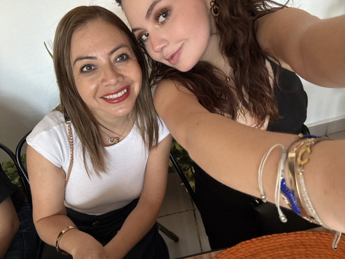 Two women pose closely for a selfie. The woman on the left wears a white t-shirt, a gold necklace, and a matching bracelet. The other woman, in a black dress, holds the camera, her arm adorned with multiple bracelets. Both women smile, showcasing their makeup. A glimpse of table setting appears at the bottom, and greenery can be seen in the background. The photo appears to be taken indoors, possibly at a dining setting.