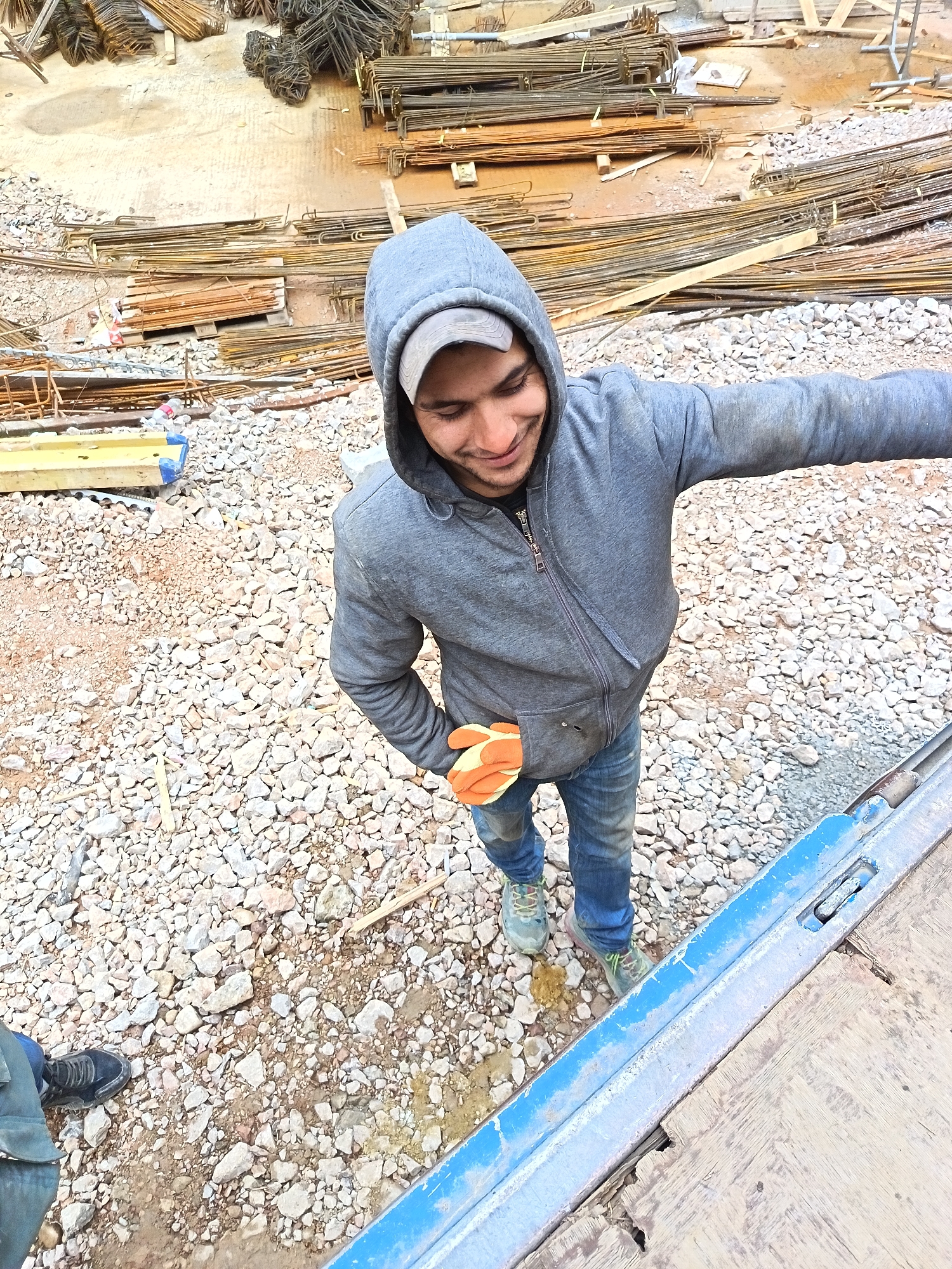 man wearing a grey hooded sweatshirt, blue jeans, and work gloves standing on a construction site. He is smiling and looking down towards the bottom right of the frame. The ground is covered in gravel and construction debris, with piles of rebar visible in the background. A blue and silver object, possibly part of the construction equipment, is in the foreground. The precise location in Sofia, Bulgaria cannot be determined from the visual information provided.