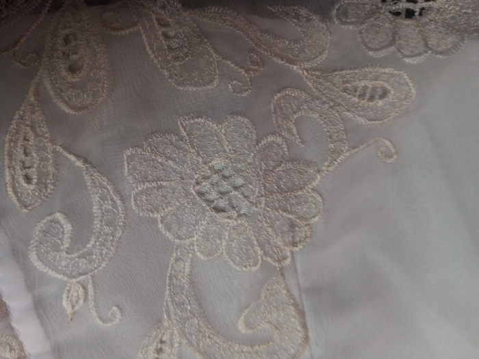 A close-up reveals a delicate, pale fabric adorned with intricate embroidery