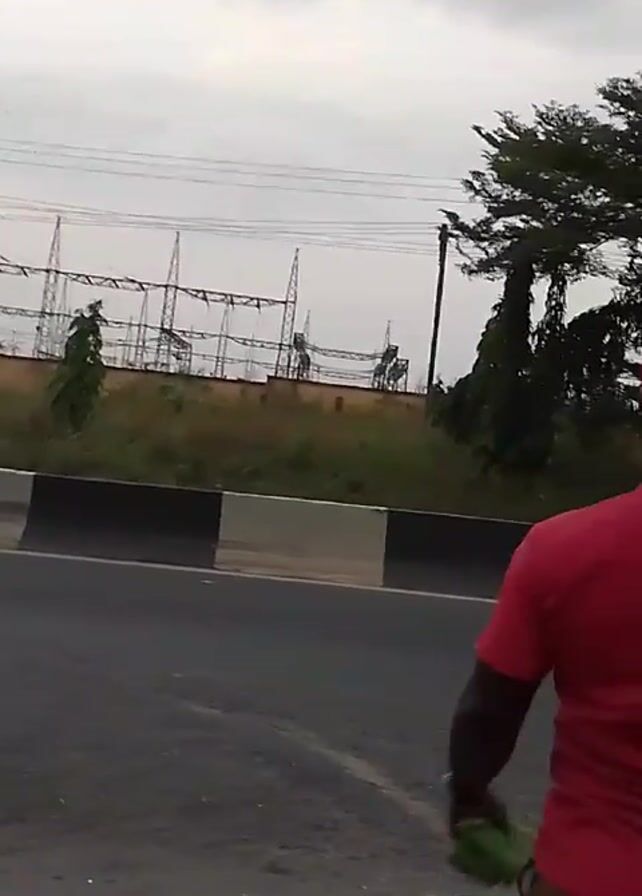 three men standing by the side of a road. A man in a red shirt and hat walks past the camera. Two other men stand on the roadside, looking toward a white van that is driving by. The background includes electrical power lines, a grassy area, and trees. The sky is overcast.