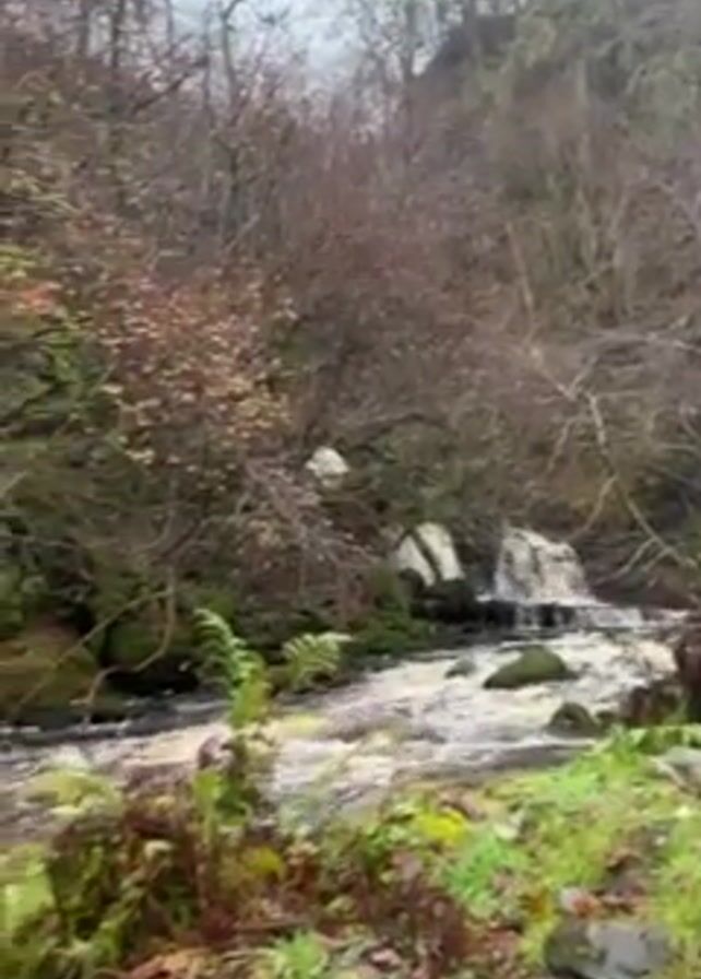 rushing stream in a wooded area. The water is brown and foamy, cascading over rocks. Moss covers many of the rocks and trees near the water's edge. The trees are mostly bare, with only a few leaves remaining. The sky is overcast and grey.