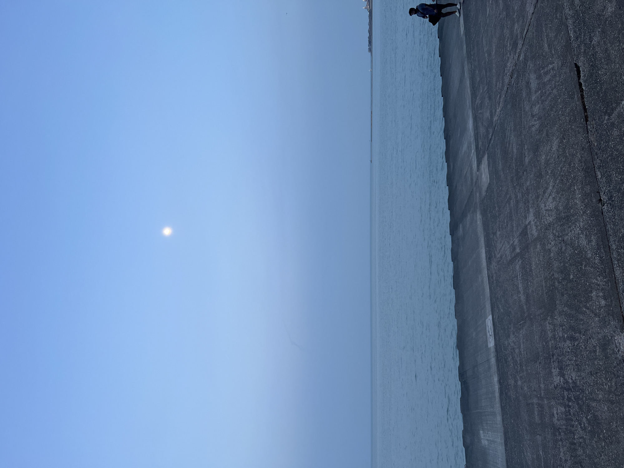 An eye-level outdoor daytime shot of a man at the water's edge on a clear day, possibly in Chicago, United States of America, next to the lake. The man is seen at the top edge of the photograph. The blue sky is mostly clear with a small white speck, possibly a sun or moon. A large concrete wall takes up the right side of the frame, and the light blue water extends to the center.
