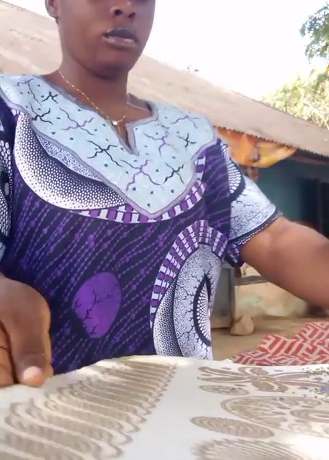 A woman with braided hair is outdoors, wearing a purple and white patterned shirt. She is standing behind a table with printed fabric on it. She lifts and folds a large beige fabric, revealing a red patterned fabric underneath. The setting appears to be rural, with a simple structure visible in the background.