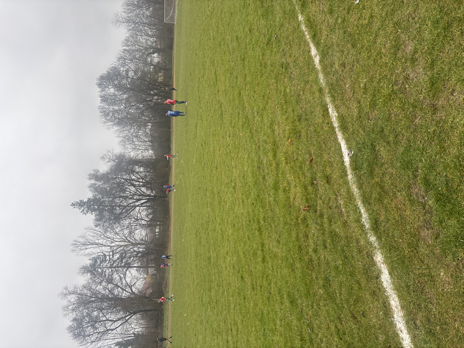 The image displays an outdoor football (soccer) pitch in Dushevo, Bulgaria, under an overcast sky. The field is predominantly green grass, with some visible wear and scattered brown leaves in the foreground. A white painted line extends diagonally across the bottom right portion of the field. In the mid-ground and background, approximately twelve individuals are present, dressed in athletic attire. Players are observed in red and green striped jerseys (three), blue jerseys (four, one with number 11 visible), red jerseys (three), and dark clothing (one). A white football goal with netting is situated on the far right side of the field. A dirt track runs horizontally behind the playing area. The background features a dense treeline composed primarily of bare deciduous trees and some evergreens, with faint outlines of structures visible beyond. The individuals are dispersed across the field, some standing, others in various stages of movement consistent with a football game or practice session.